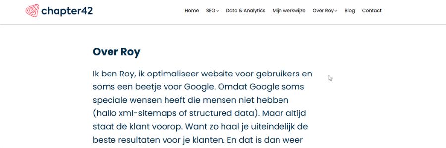 Chapter42 over Roy: Als je ergens goed kan afkijken hoe je een pagina moet maken dan is het wel bij SEO experts zelf, al zijn SEO’s zelf vaak wel wat lui en lopen ze op de eigen site nogal eens achter. De pagina van Roy Huiskes is boven alles best wel grappig om te lezen.