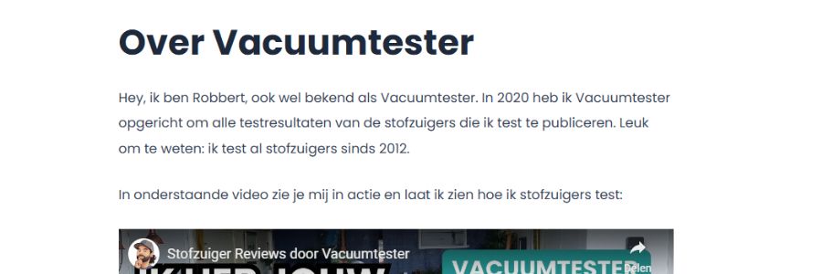 Vacuumtester over mij: Niets is krachtiger dan de ‘mij’ approach als het een persoonlijke website betreft. Dat is wat men wil zien en direct trust opwerkt om beter gevonden te kunnen worden in Google. Ook direct al een Youtube filmpje zichtbaar: geeft direct aan dat je met een expert te maken hebt.